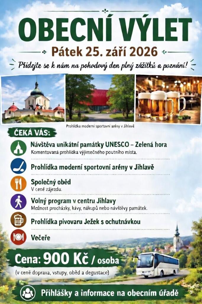 Obecní úřad ve spolupráci s SDH Semechnice pro Vás připravili výlet, který se uskuteční v pátek 25.9.2026. Plánovaný odjezd v 06:15 hodin, příjezd kolem 23:00 hod. V případě zájmu se prosím nahlaste na obecním úřadě. Těšíme se na pěkný program ve Žďáru nad Sázavou a zejména Jihlavě.