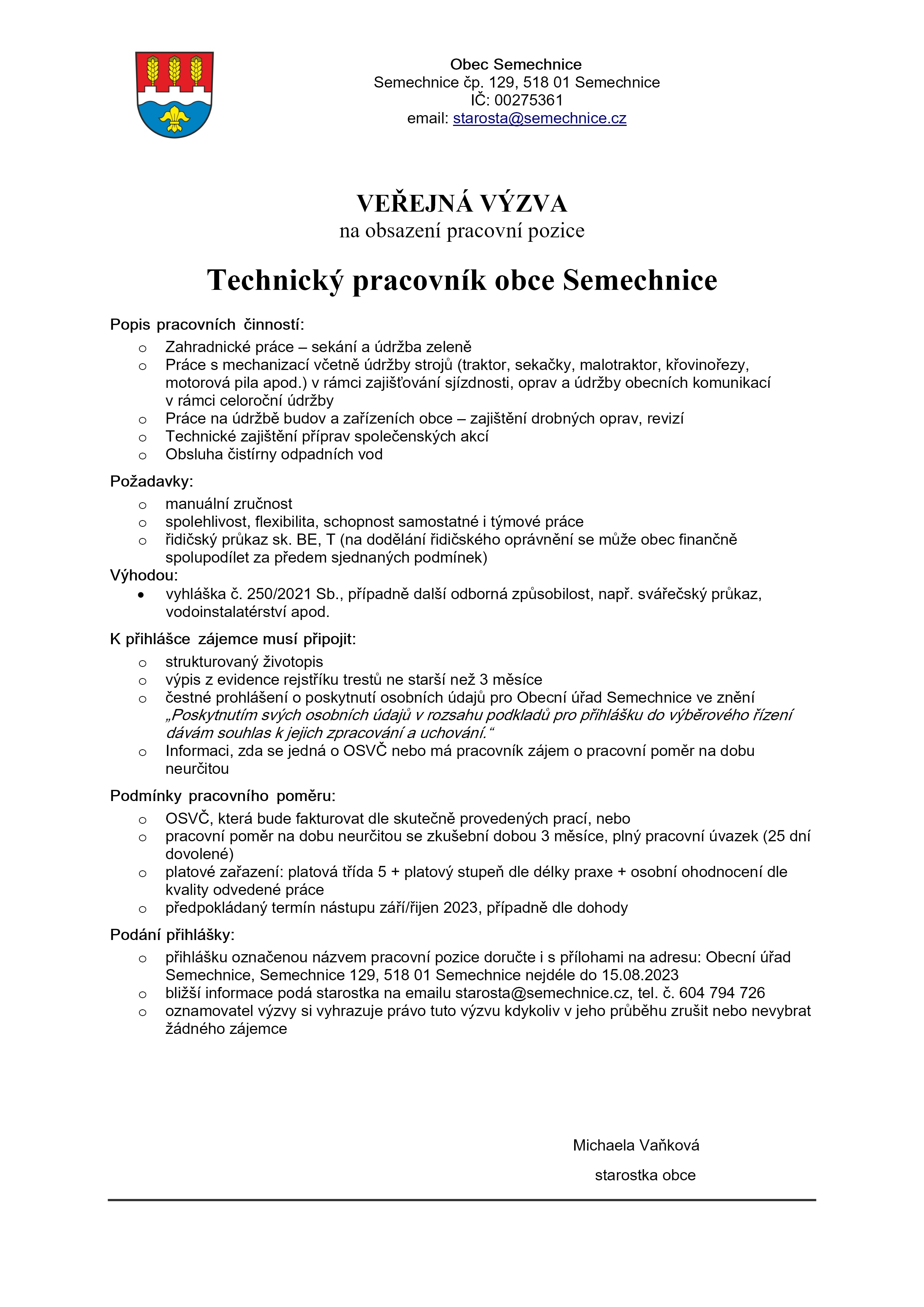 Veřejná výzva na obsazení pracovní pozice - Technický pracovník obce Semechnice